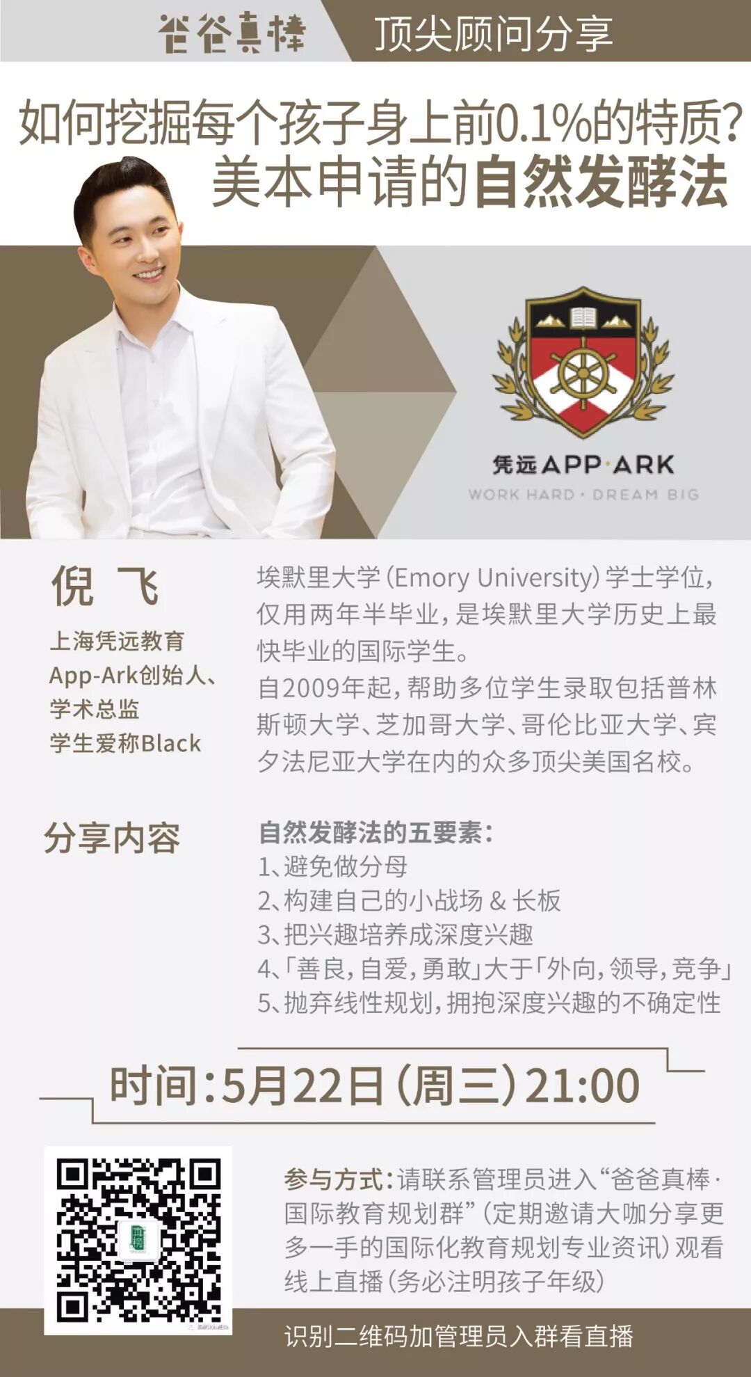 当然,如果你想要和倪飞老师一对一沟通,或者深入了解凭远的申请方法论,可以扫下方二维码找凭远小助手预约。作为独家福利,倪飞老师非常热情的给“爸爸真棒”的家长免费开一堂线上课,聊一聊凭远最为精华的“美本申请自然发酵法”,帮助孩子找到属于自己的前0.1%的特质,绝对干货,不容错过。