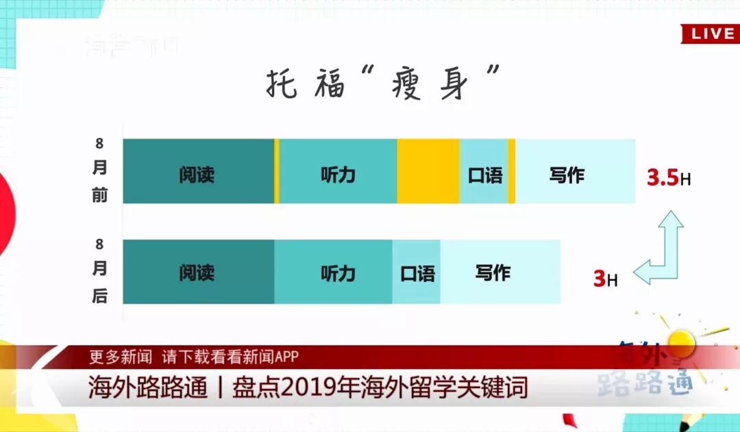 自8月1日起,托福考试时间缩短了30分钟,调整为3小时,整体考试形式和题目类型保持不变,听力、口语部分的题目数量有所减少。